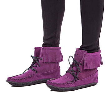 These Native Canadian Women Shoes - Boots with fringes and flat rubber soles are beautiful. These authentic Hiawatha short boots are handmade of genuine leather.
