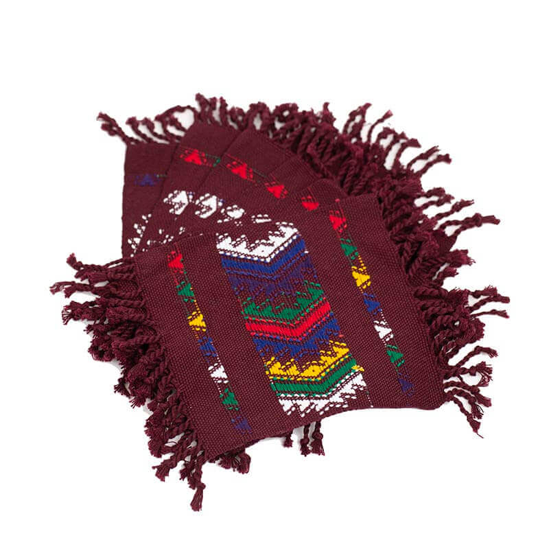 Beautiful set of 6 Chestnut Brown Coasters with colorful Maya design. They will bright your table and delight your guests. These cotton coasters are available in a variety of designs and colors. A unique fairtrade season gift.