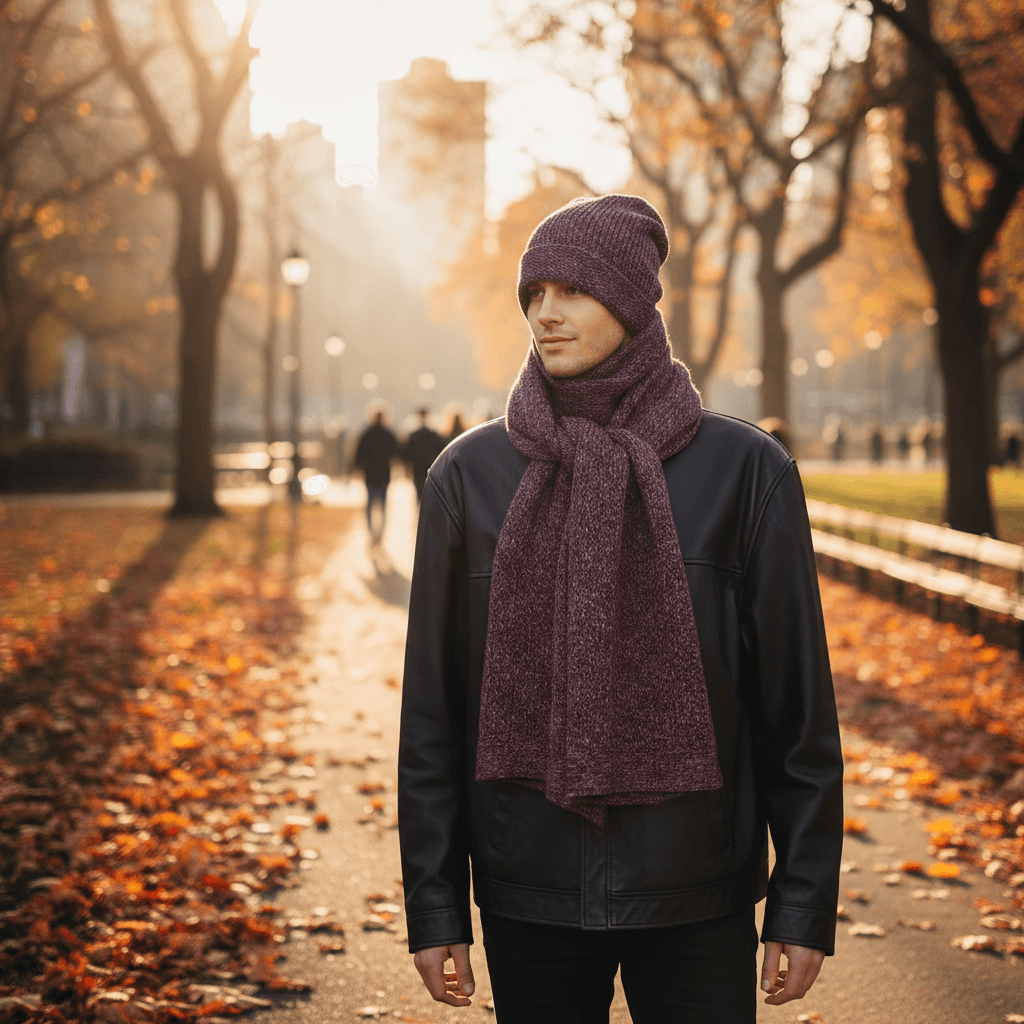 Our Scarf and Hat Mulberry, is a luxurious set designed for the discerning gentleman. Handmade with a rich dark red mulberry yarn, this set provides not just style, but also unparalleled softness and warmth. Qualities that make this winter scarf and hat a perfect choice fot he colder seasons.
